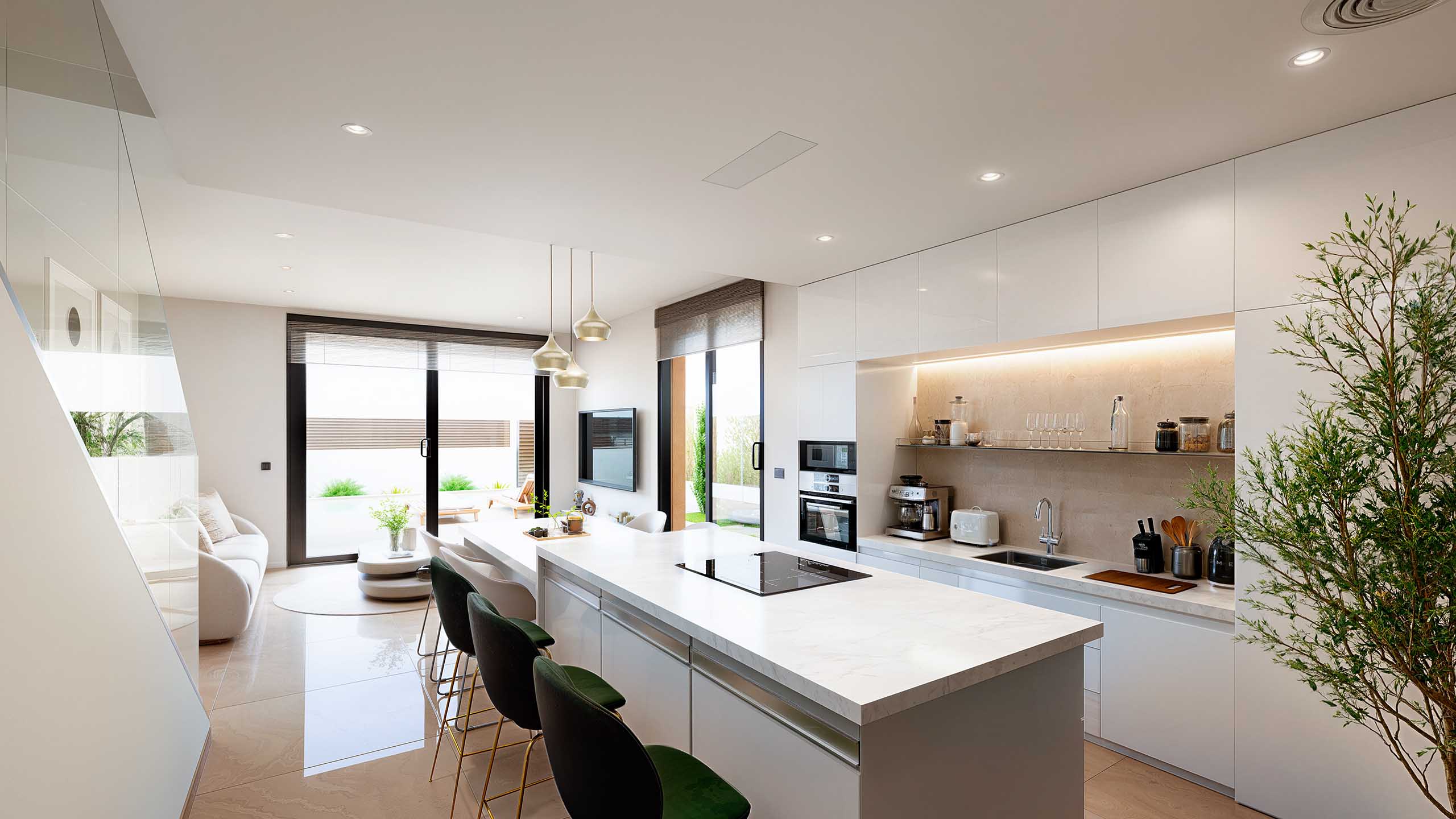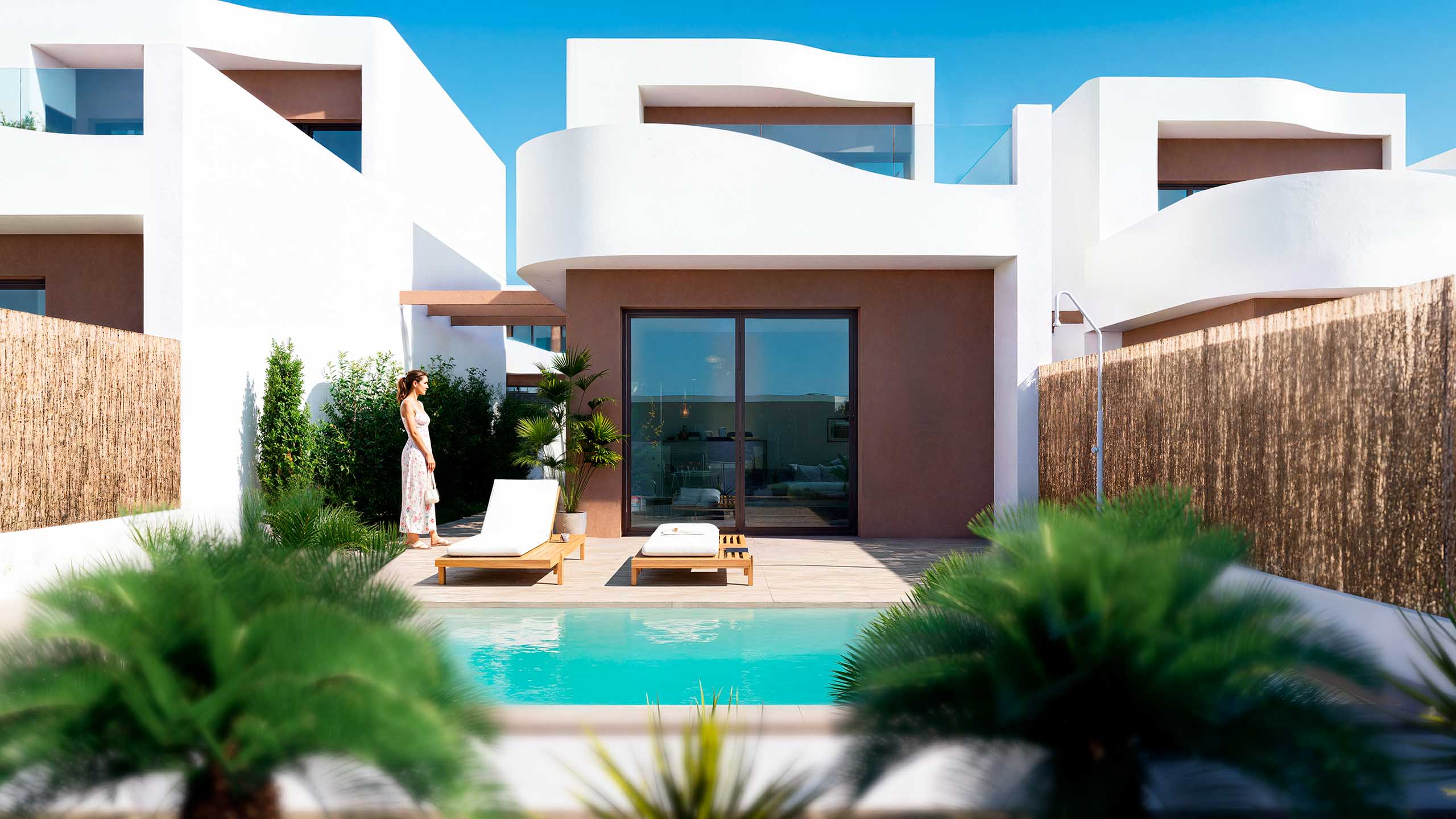 Cada villa ofrece una parcela privada con piscina y amplias terrazas, creando un espacio único para disfrutar del clima mediterráneo durante todo el año. Su diseño, cuidado hasta el último detalle, se caracteriza por amplias estancias con ventanales que inundan los interiores de luz natural, y una selección de materiales de alta calidad que ofrecen un toque de sofisticación y confort, a la vez que favorecen la conexión entre el interior y el exterior.